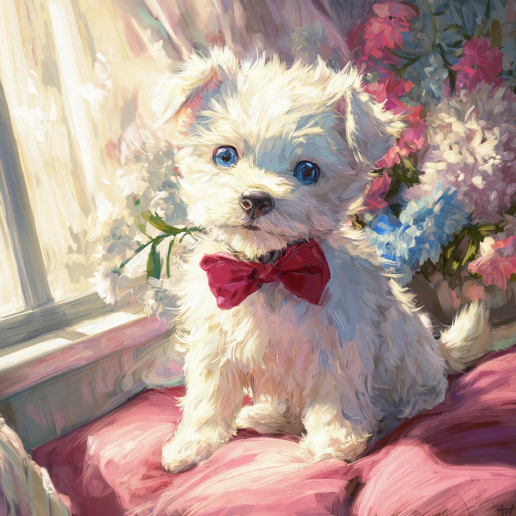 جرو لطيف بأسلوب الأنمي بفرو أبيض كثيف، وعيون زرقاء لامعة، يرتدي ربطة عنق حمراء صغيرة، يجلس على وسادة وردية ناعمة، وضوء الشمس الناعم يتسرب من نافذة، وخلفية مفصلة مع زهور.