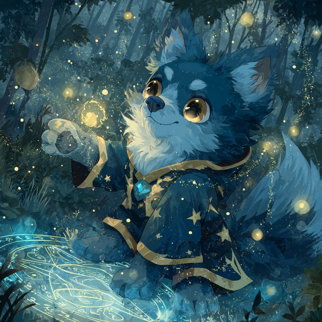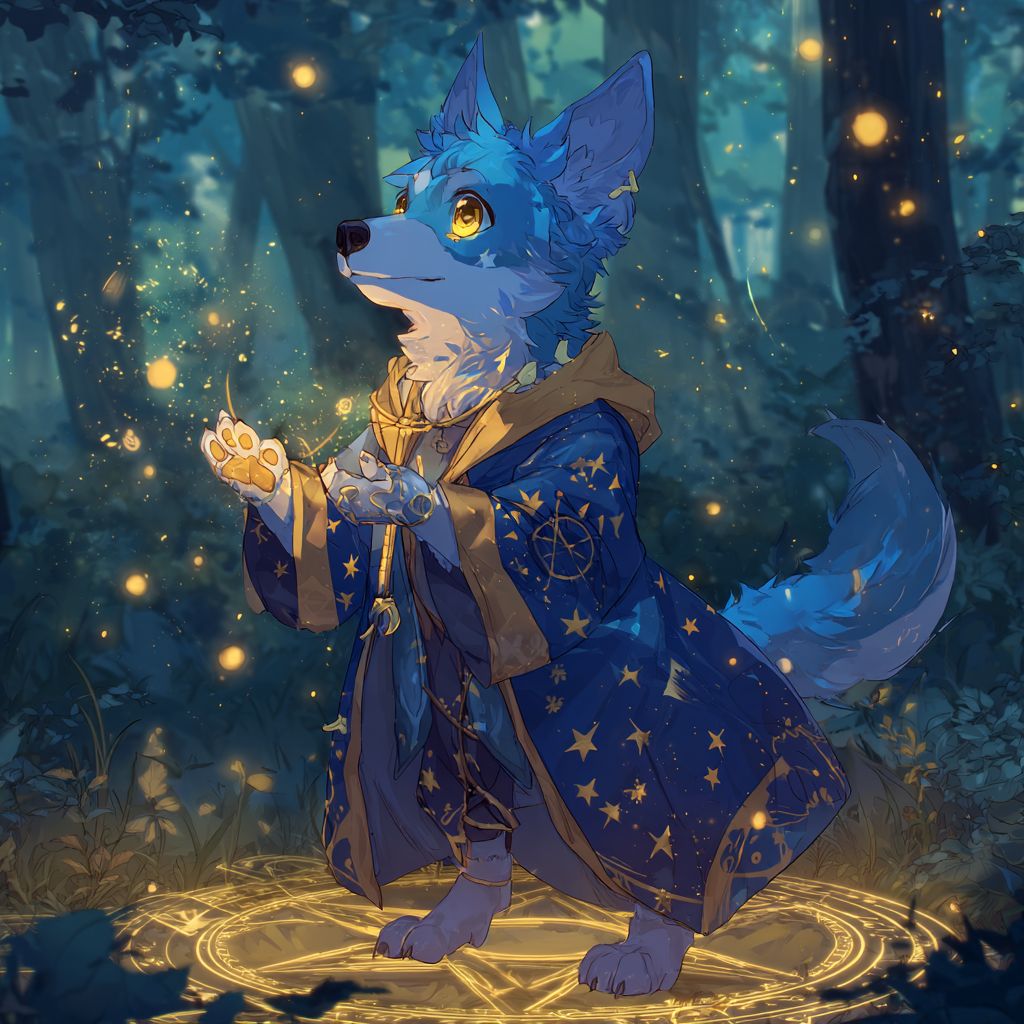 كلب أنمي غامض بفرو أزرق متلألئ وعينين ذهبيتين، يرتدي رداء ساحر مزين بنقوش النجوم، يلقي تعويذة بأقدام متوهجة، في غابة مسحورة برموز عائمة.
