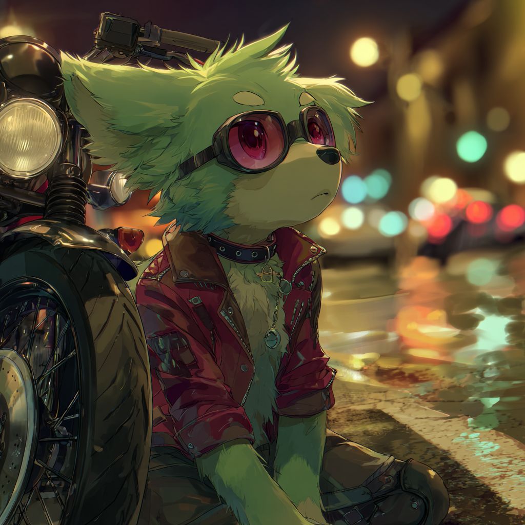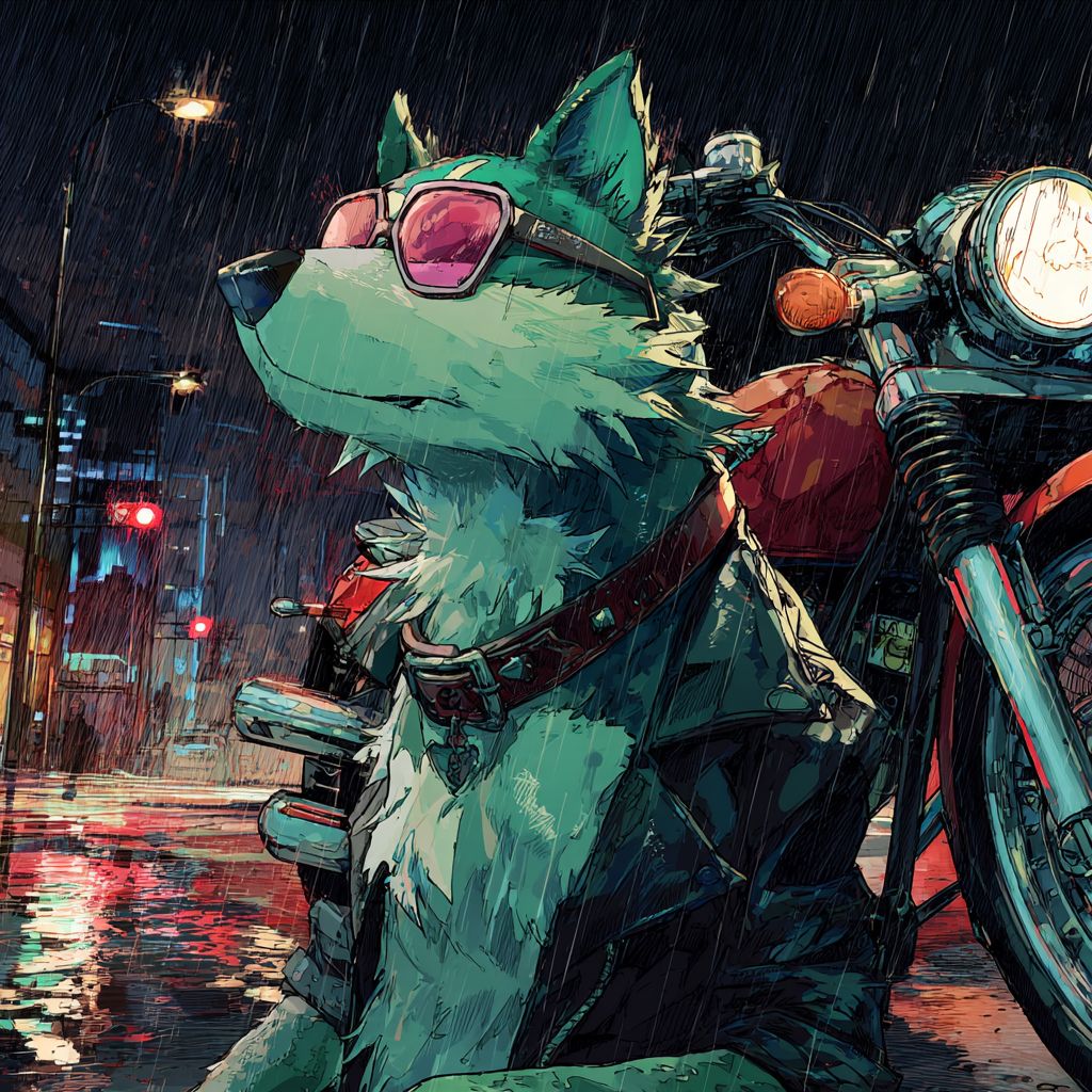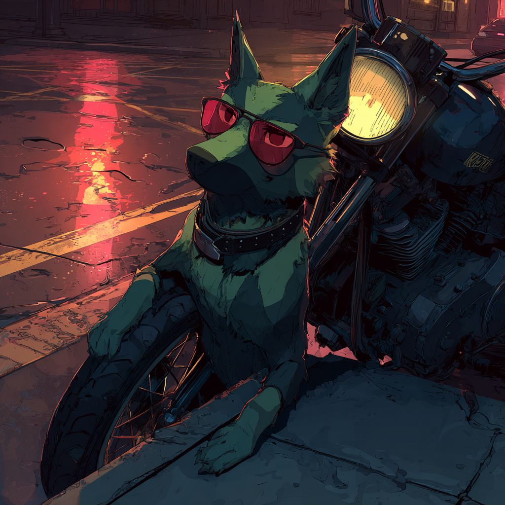 كلب أنيمي رائع ذو فرو أخضر قصير وعينين حمراء يرتدي نظارات شمسية وقلادة جلدية، متكئًا على دراجة نارية في مشهد ليلي للمدينة مع شوارع رطبة